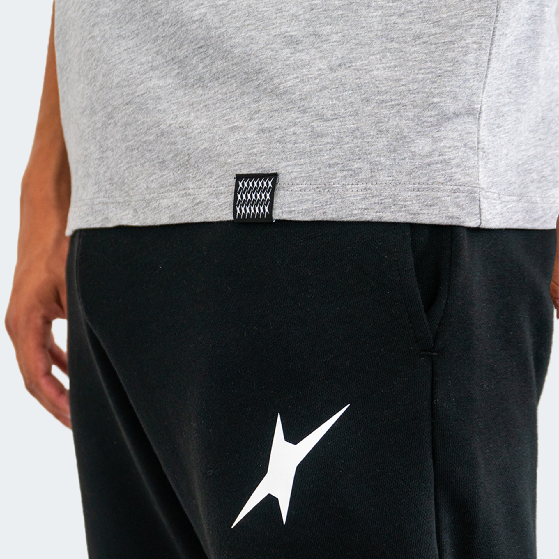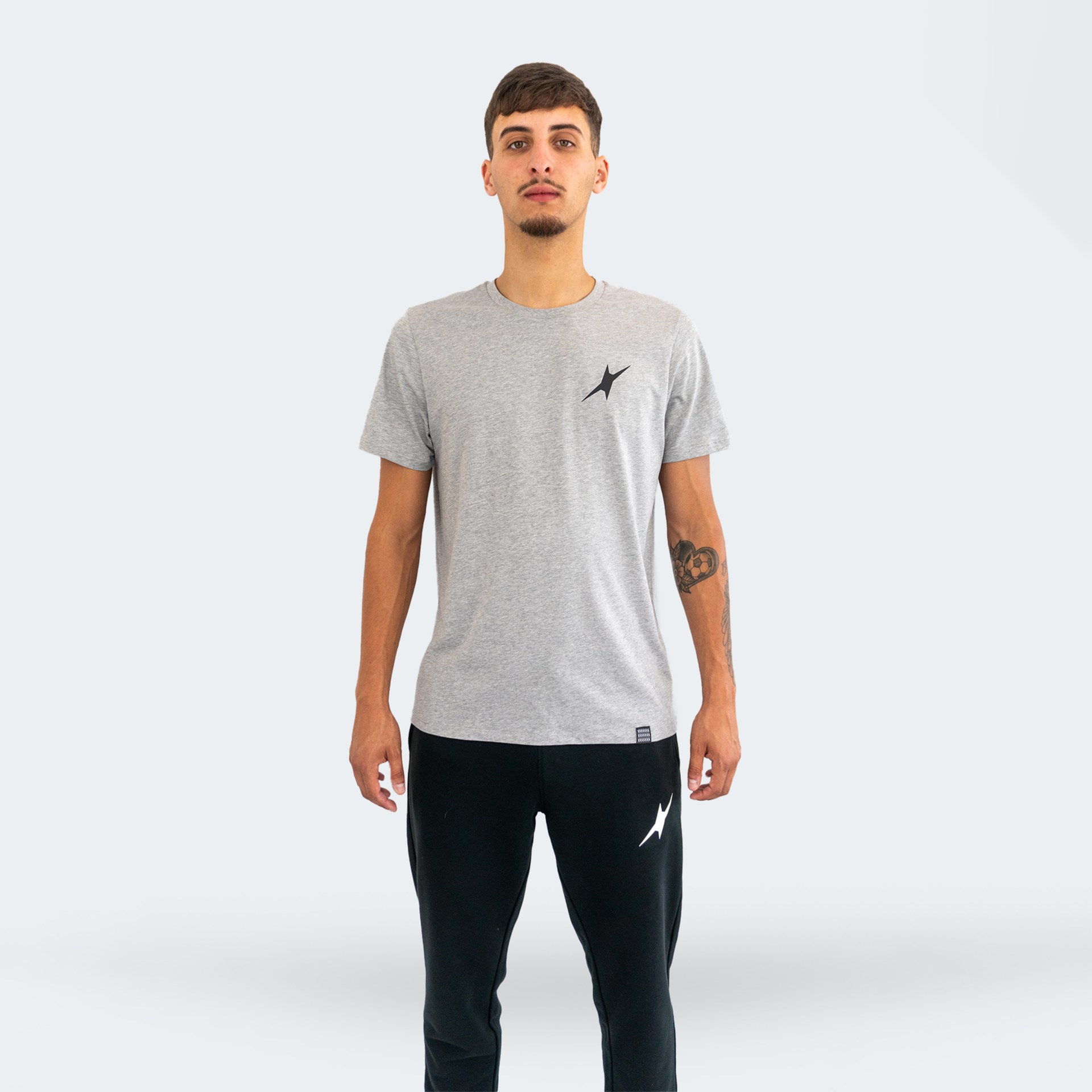 • T-shirt cinzenta e calças pretas com símbolo branco