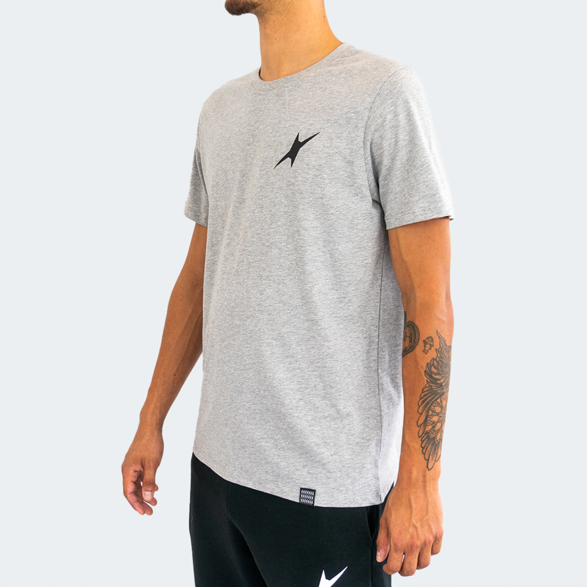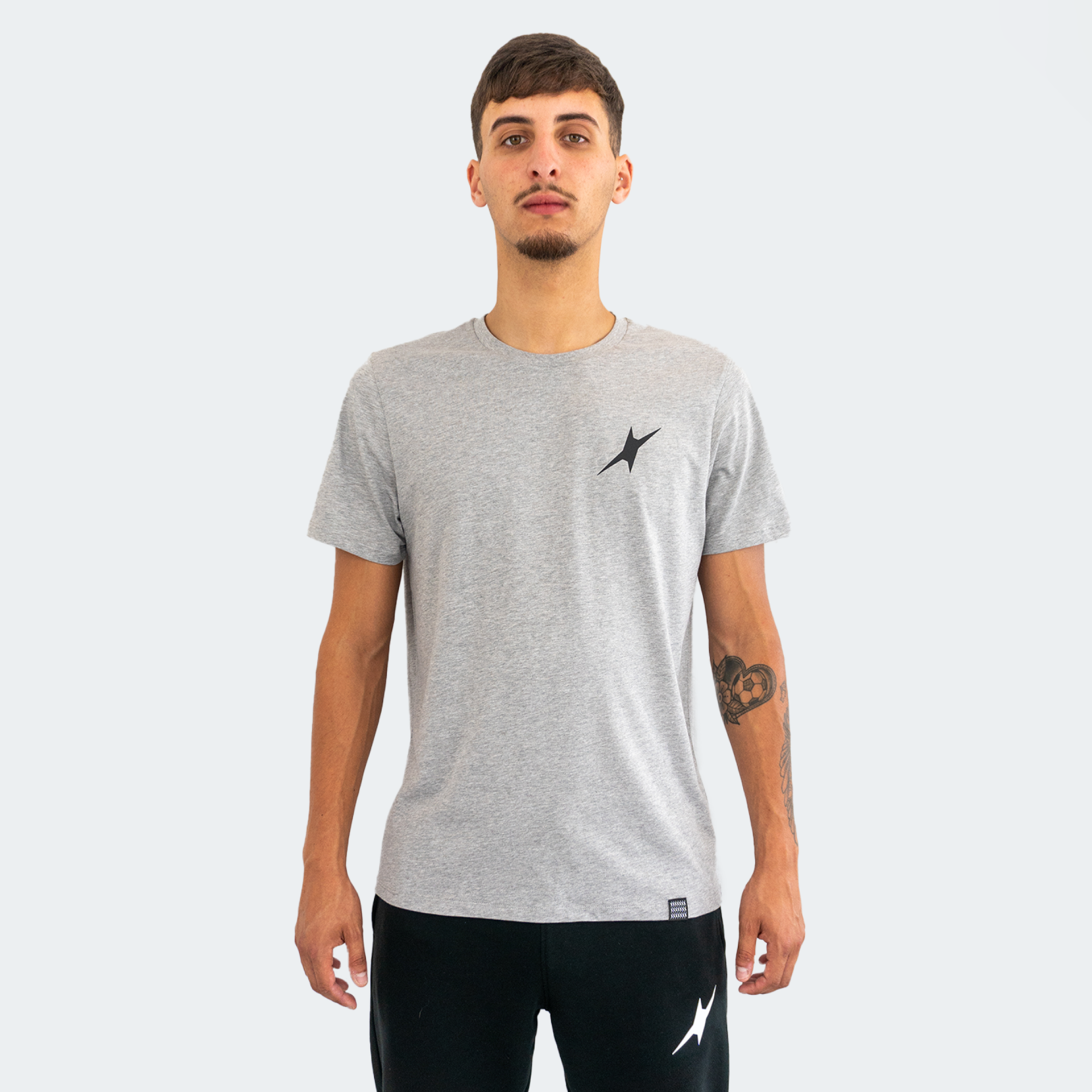 • T-shirt cinzenta com logótipo preto usada por homem com calças pretas