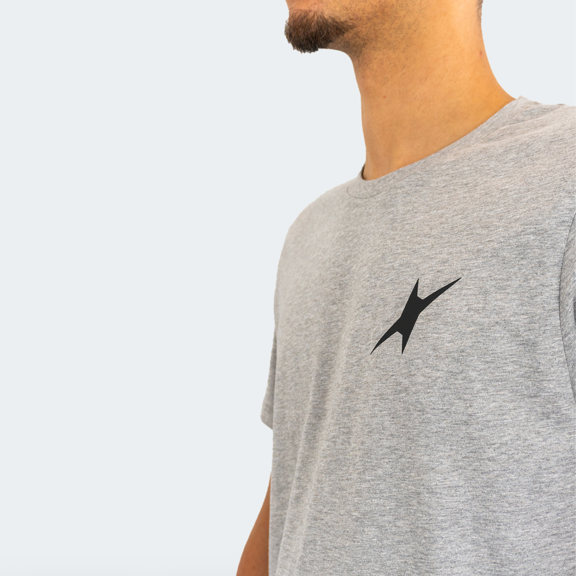 • Homem a usar t-shirt cinzenta com padrão preto no peito