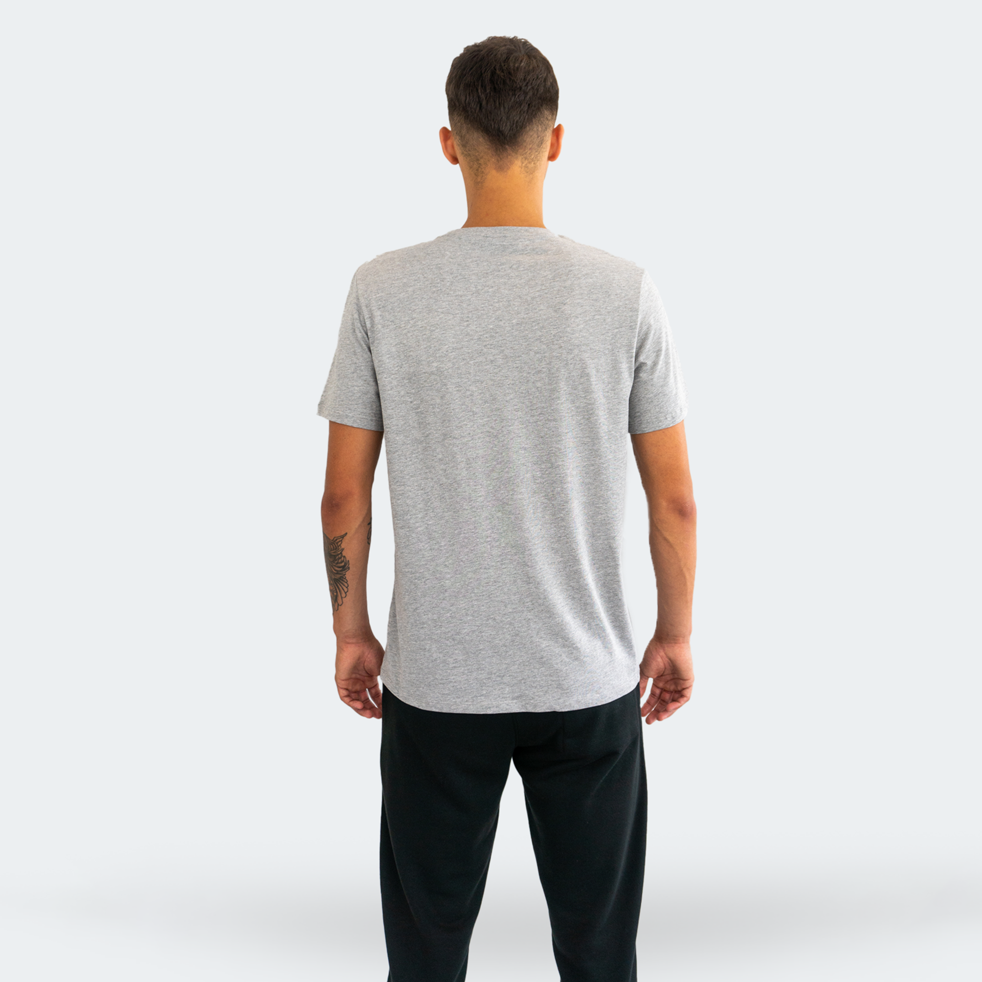 • Pessoa de costas a vestir uma t-shirt cinzenta de manga curta